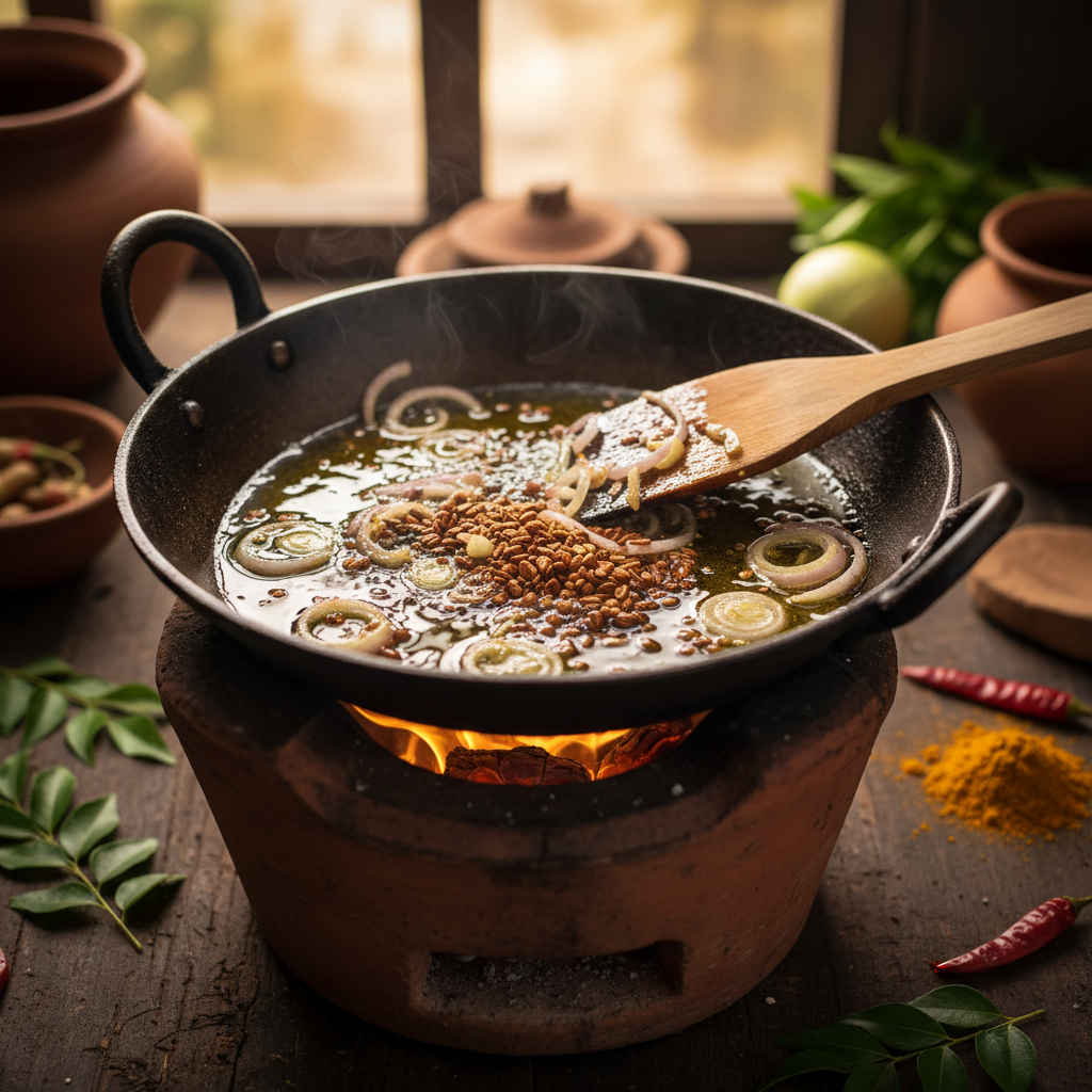 ఏ కూర చేసినా, తాలింపు ముఖ్యమే. బానలిలో నూనె వేసి మెంతులు, ఉల్లిపాయలు సరిగ్గా వేయించే విధానం ఇక్కడ చూడండి. ఇది మీ వంటకానికి అద్భుతమైన రుచిని, సువాసనను ఇస్తుంది.